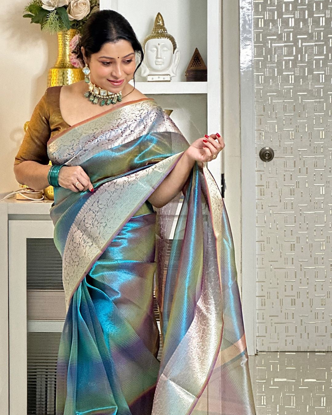 Tissue Silk Saree Dual Tone of Lilac and Gold Hues