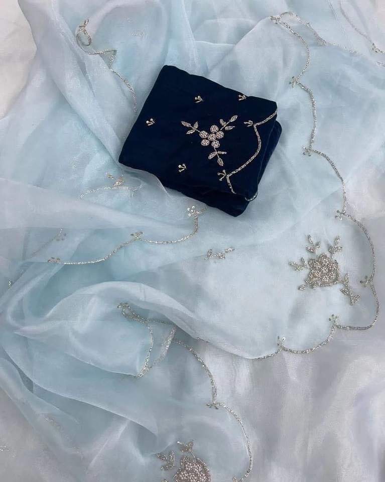 Organza hand work Khatli and Pearl Work saree with DEEP NAVY BLUE Color Velvet Khatli Work blouse piece
