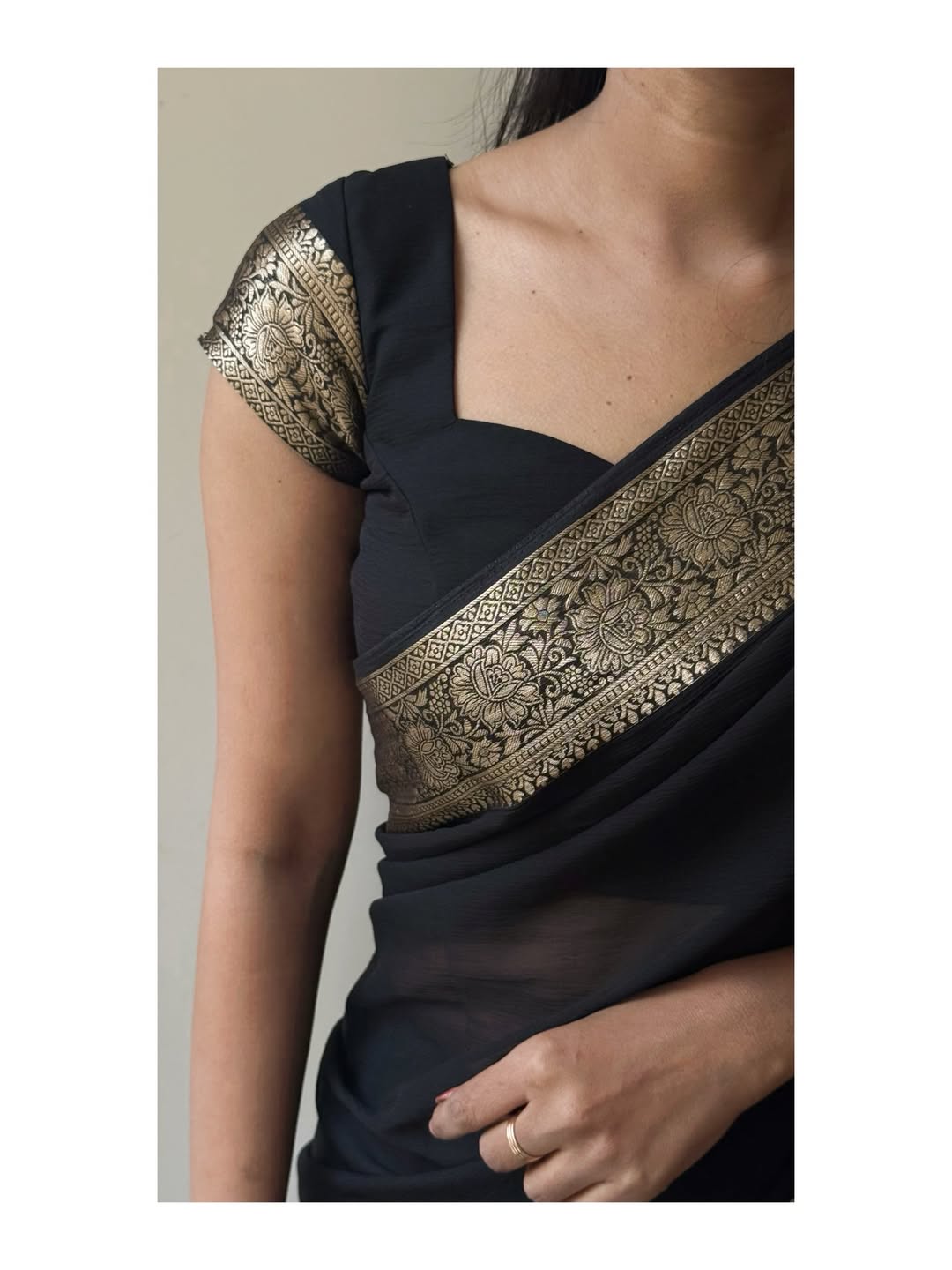 Bold Black Elegance Chiffon Saree— sheer grace with a rich golden border, timeless and powerful..