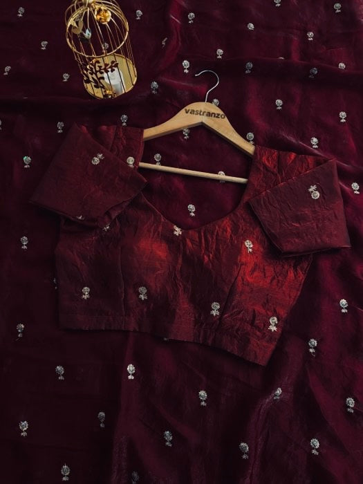 DEEP MAROON Color Stardust Satin Saree Dual Shaded Sequins Jari Butti Work Allover the saree paired with Deep Maroon Color Sequins work Blouse