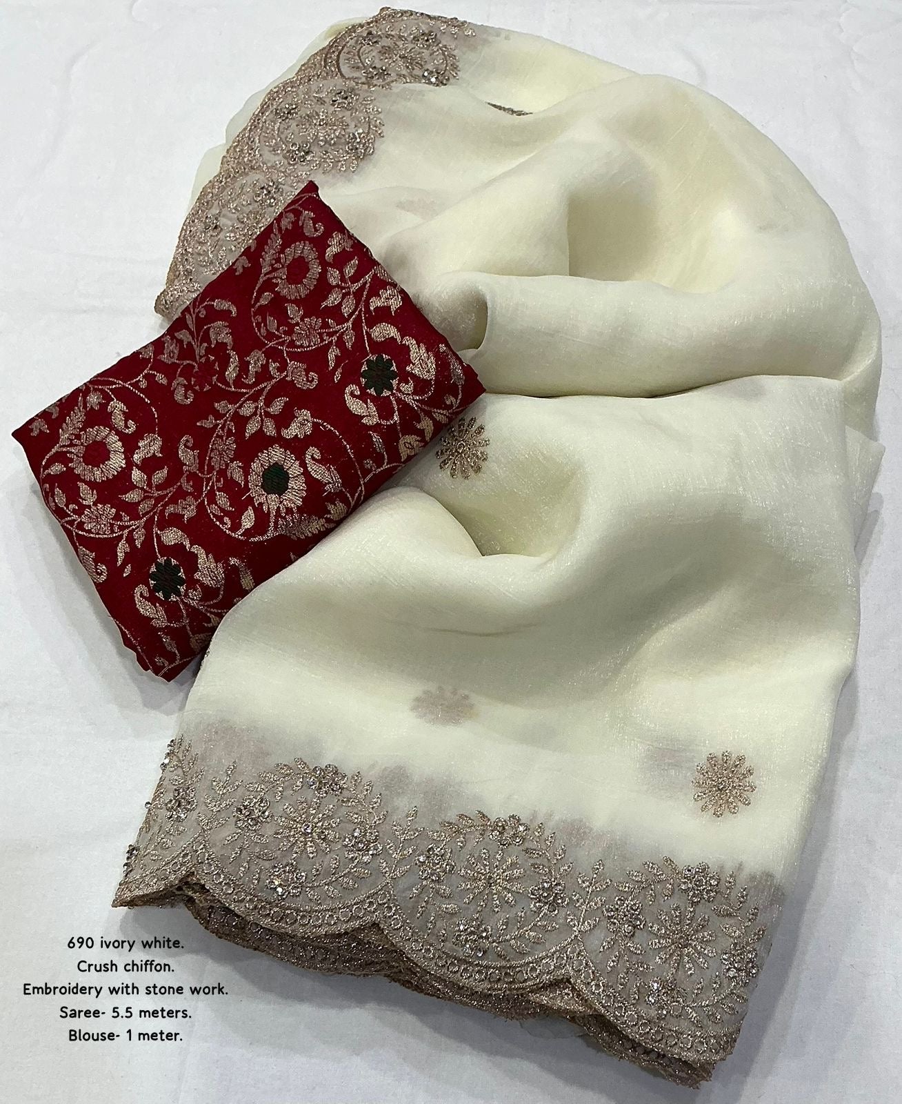 IVORY WHITE Color soft crunchy crush georgette saree with zari embroidery and stone work