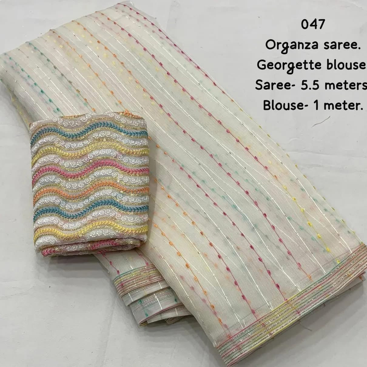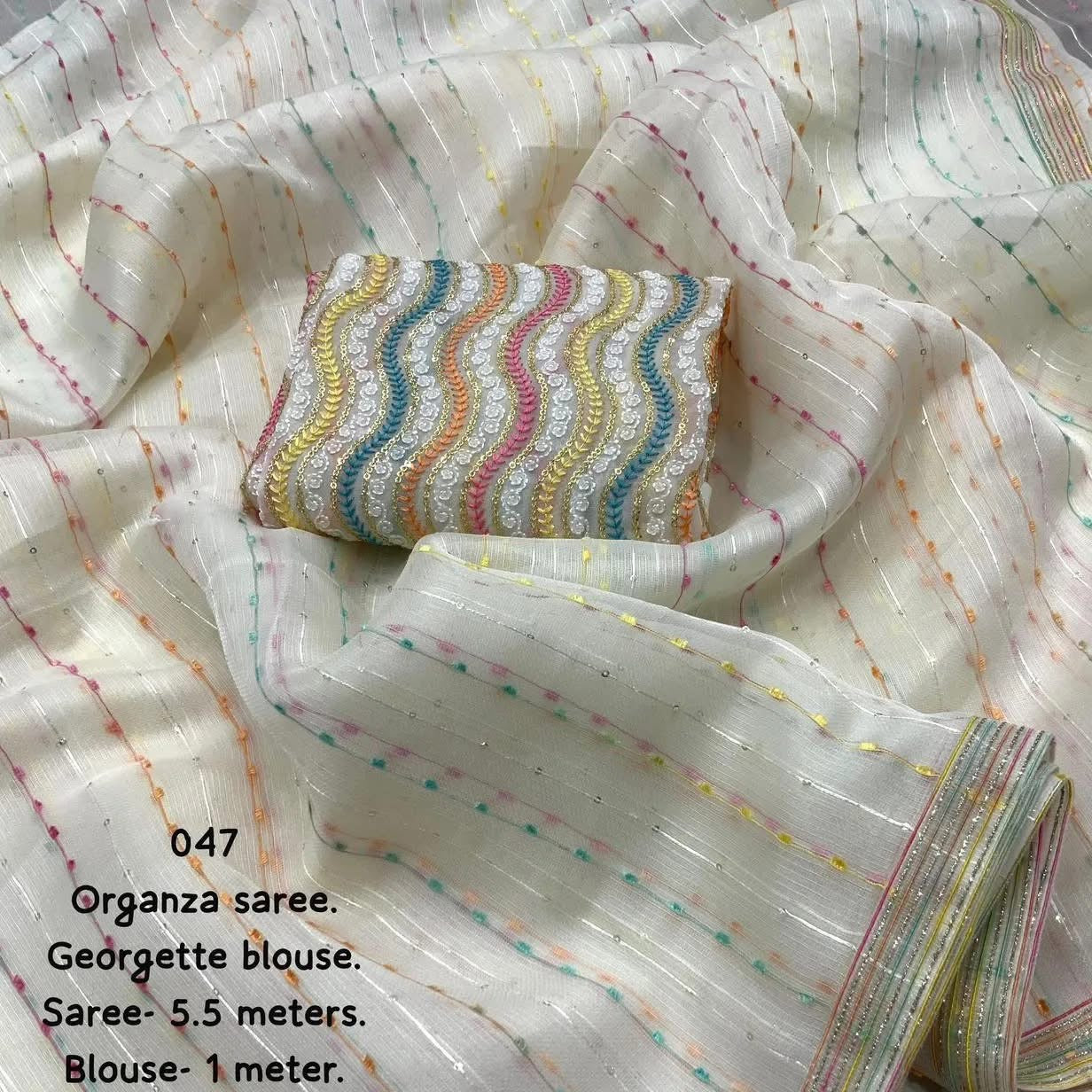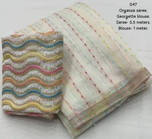 Saree - light weight organza saree with multicolour thread design with Perfectly matched sober multicolour patched lace Border and Pallu