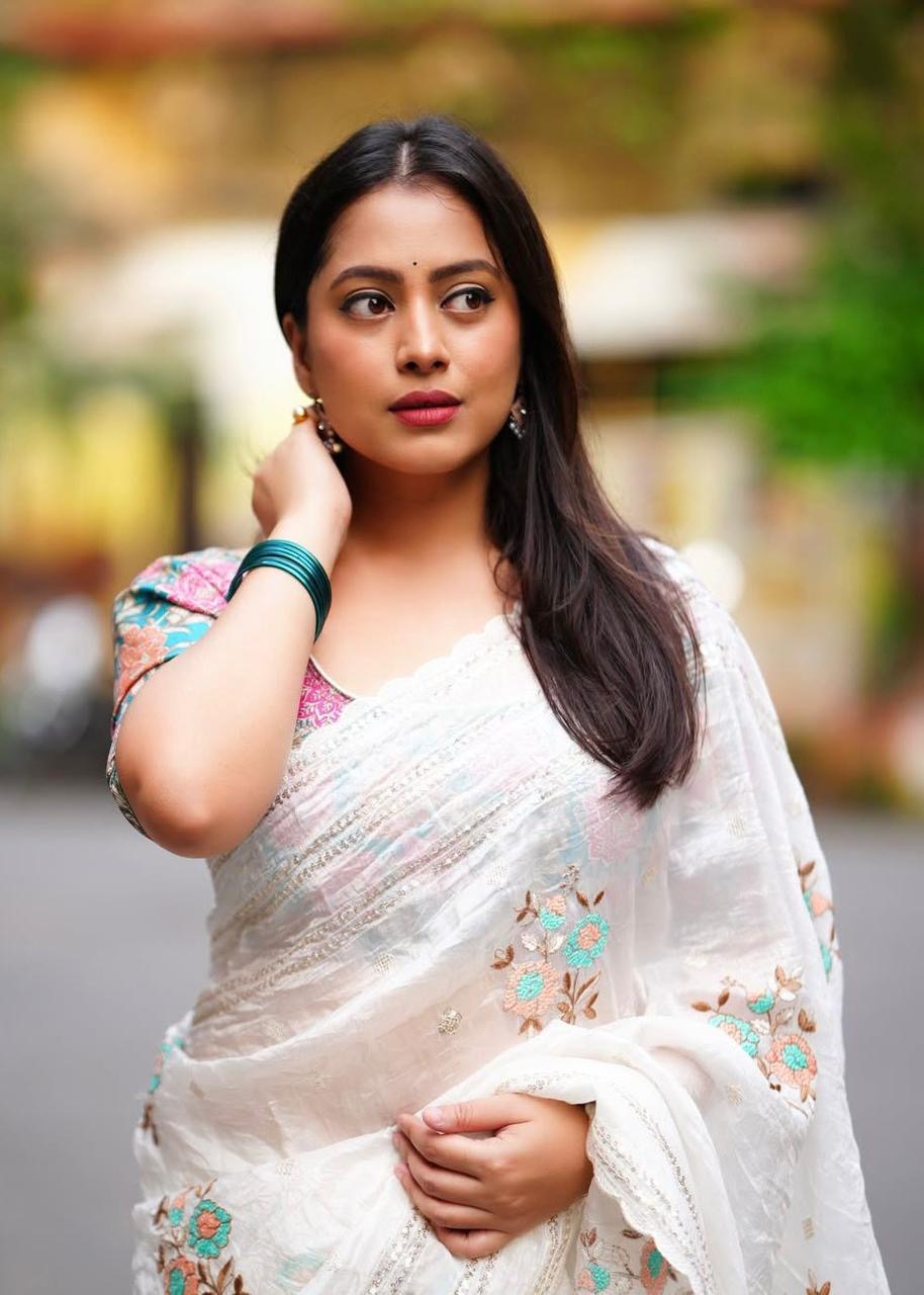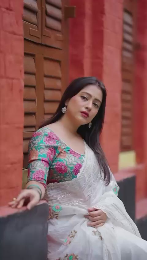 Off White Vanila color Paper Silk Saree with Beautiful combination tone to tone thread work with multicolour floral embroidery