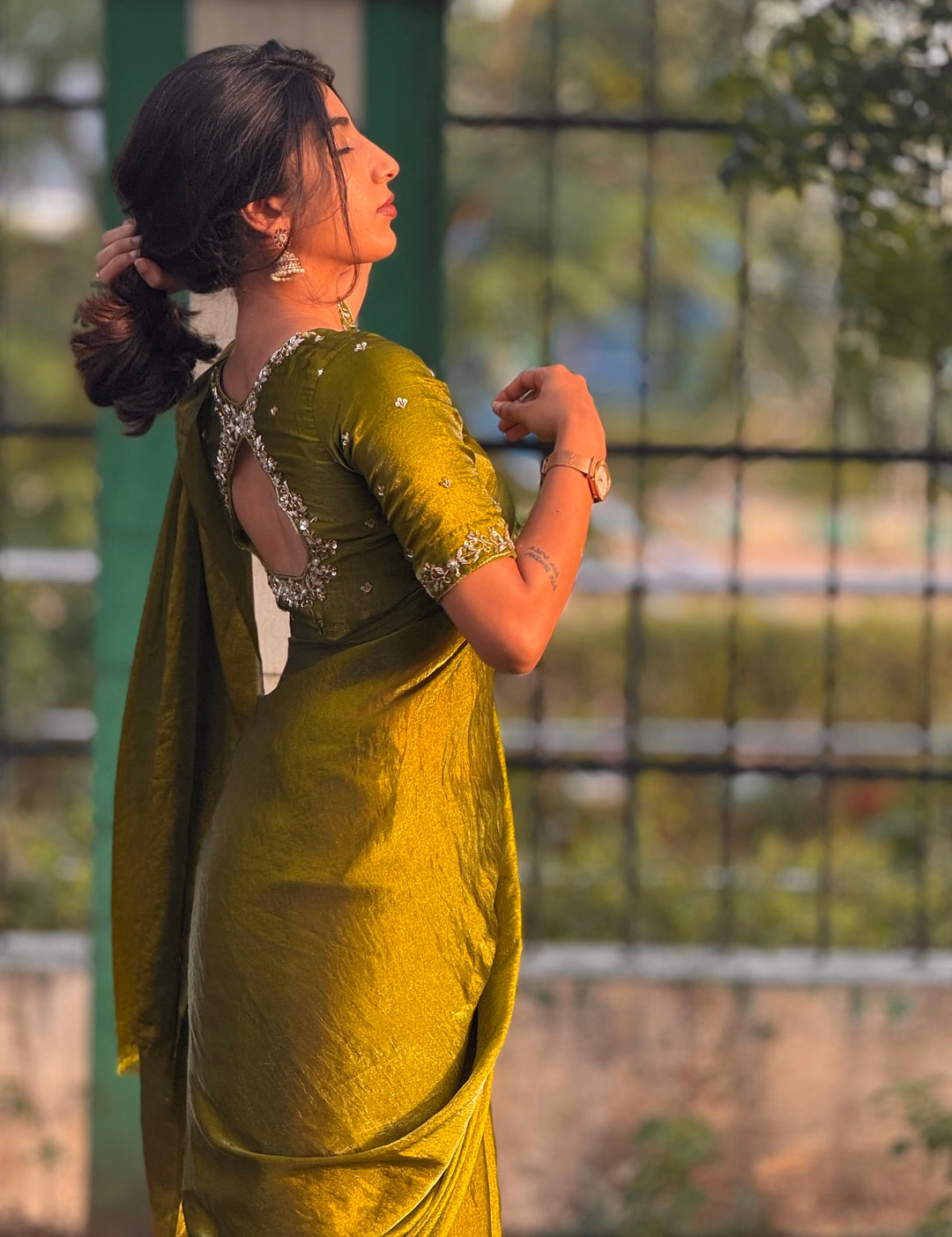 Olive Tone green space silk saree With its fluid shine and graceful drape