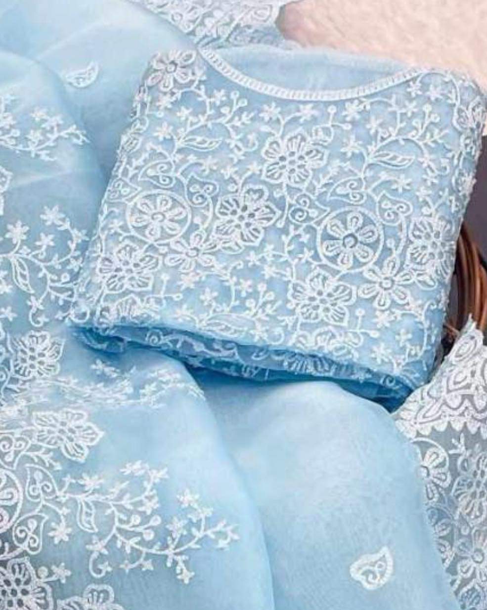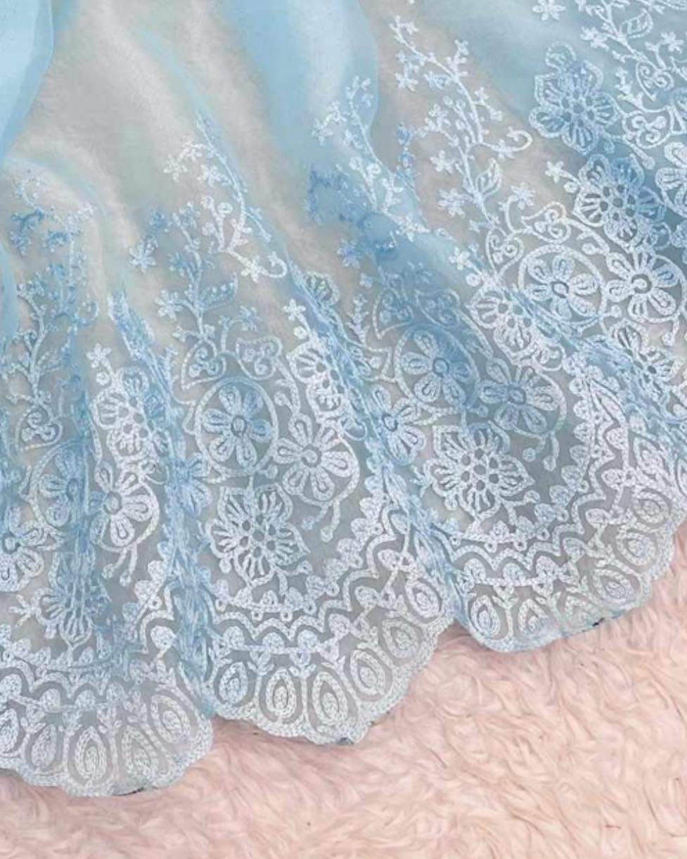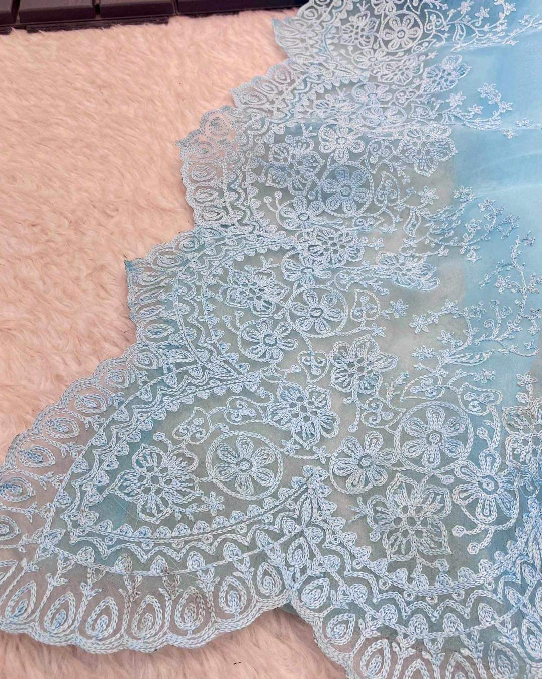 Organza Saree embellished with dori, Hand embroidery and cut-work. Saree comes with unstitched Organza Full worked blouse piece