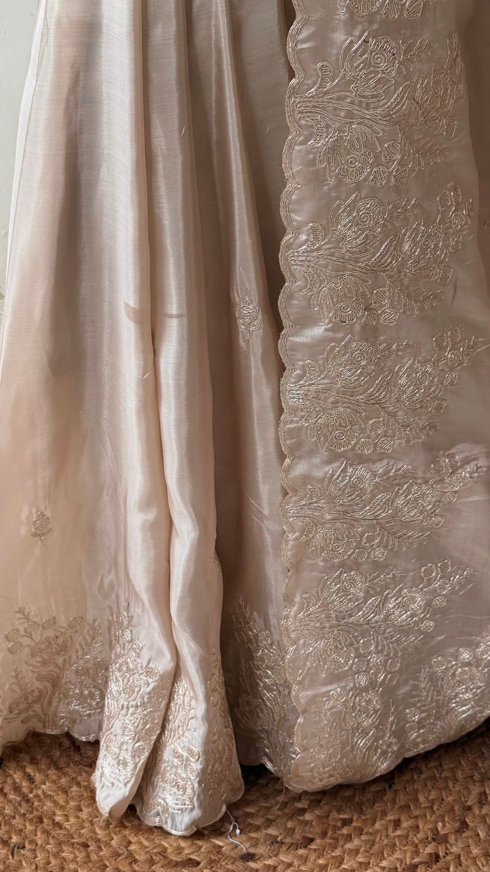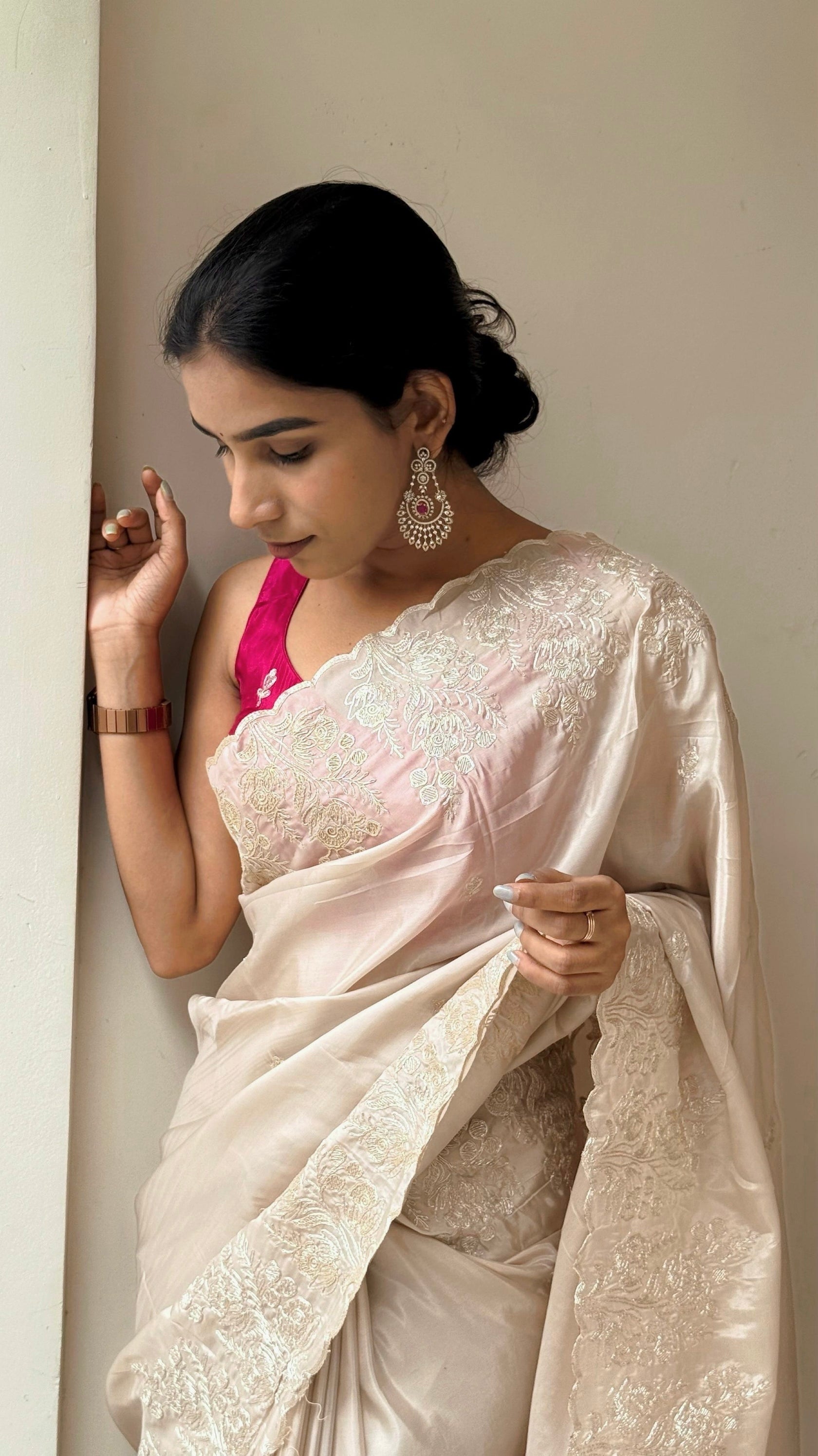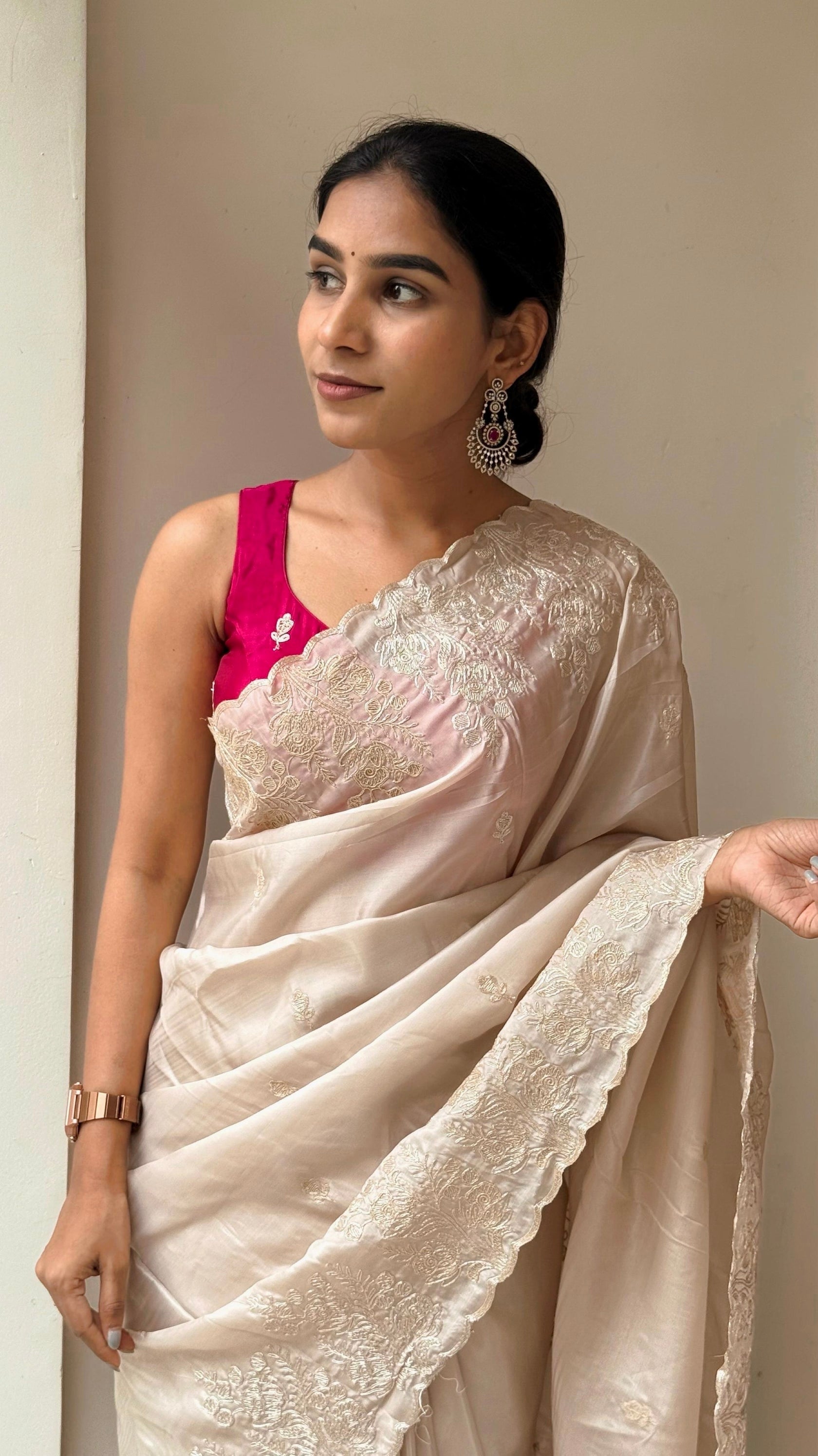 A stunning combination of PASTEL IVORY COLOR Saree CRAPE SATIN and vibrant rani pink Blouse Piece creates a timeless look. The bright pink blouse is beautifully detailed with delicate white floral embroidery, adding a refined charm.