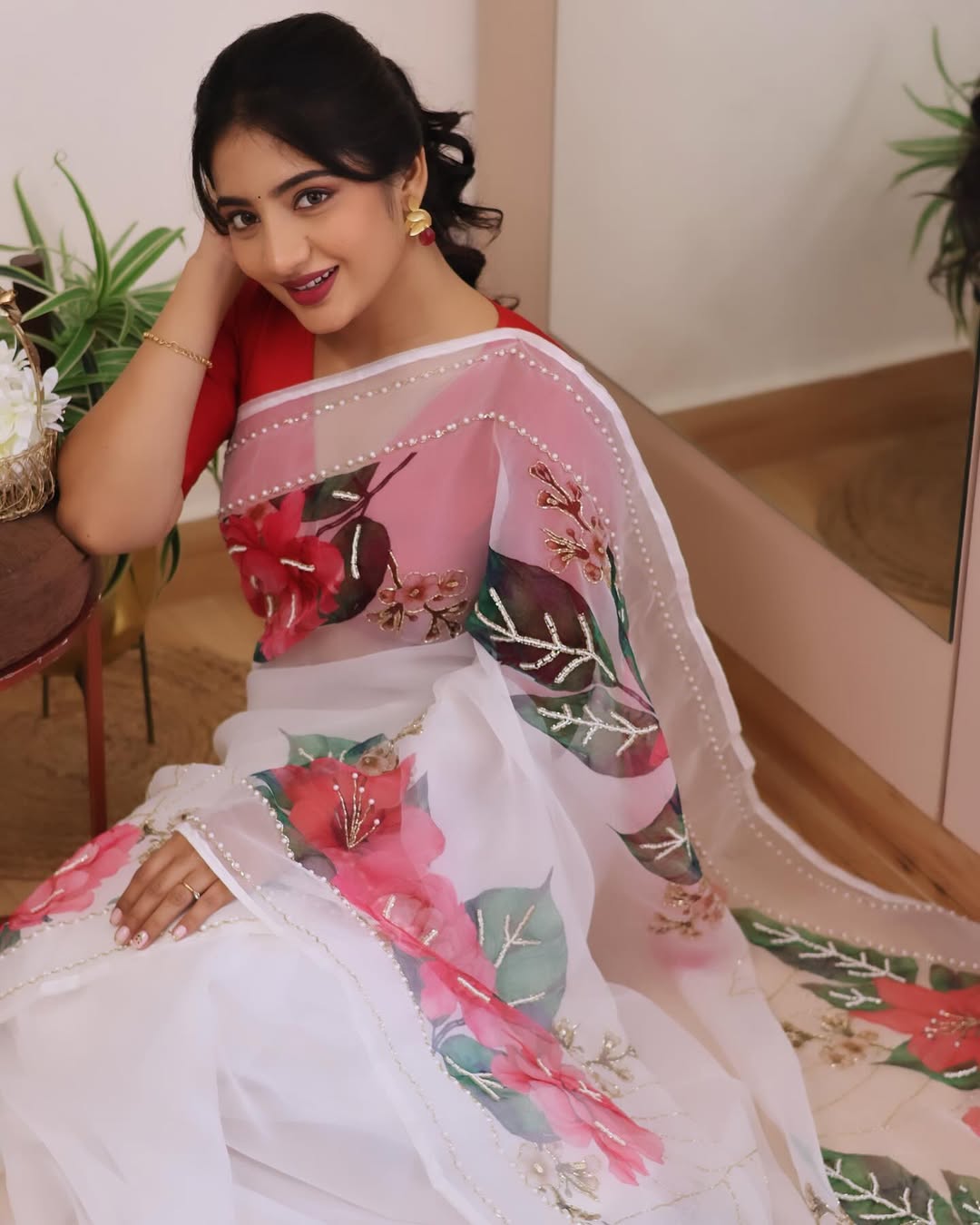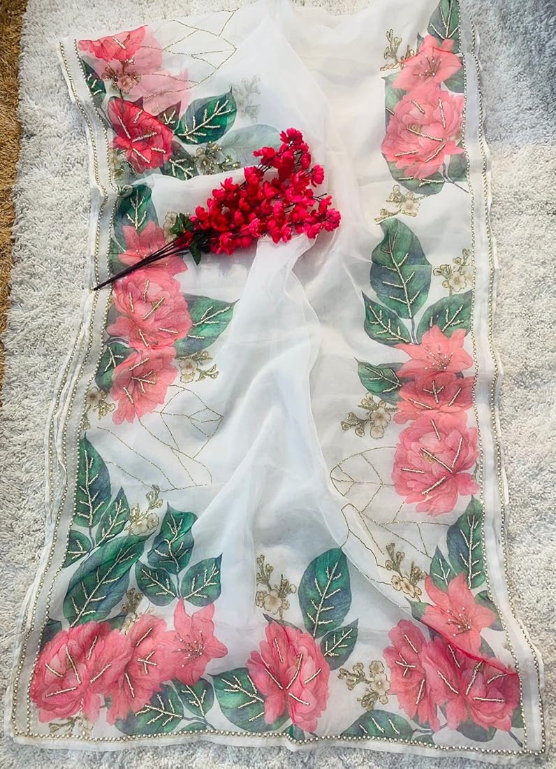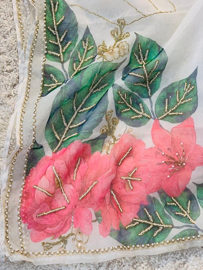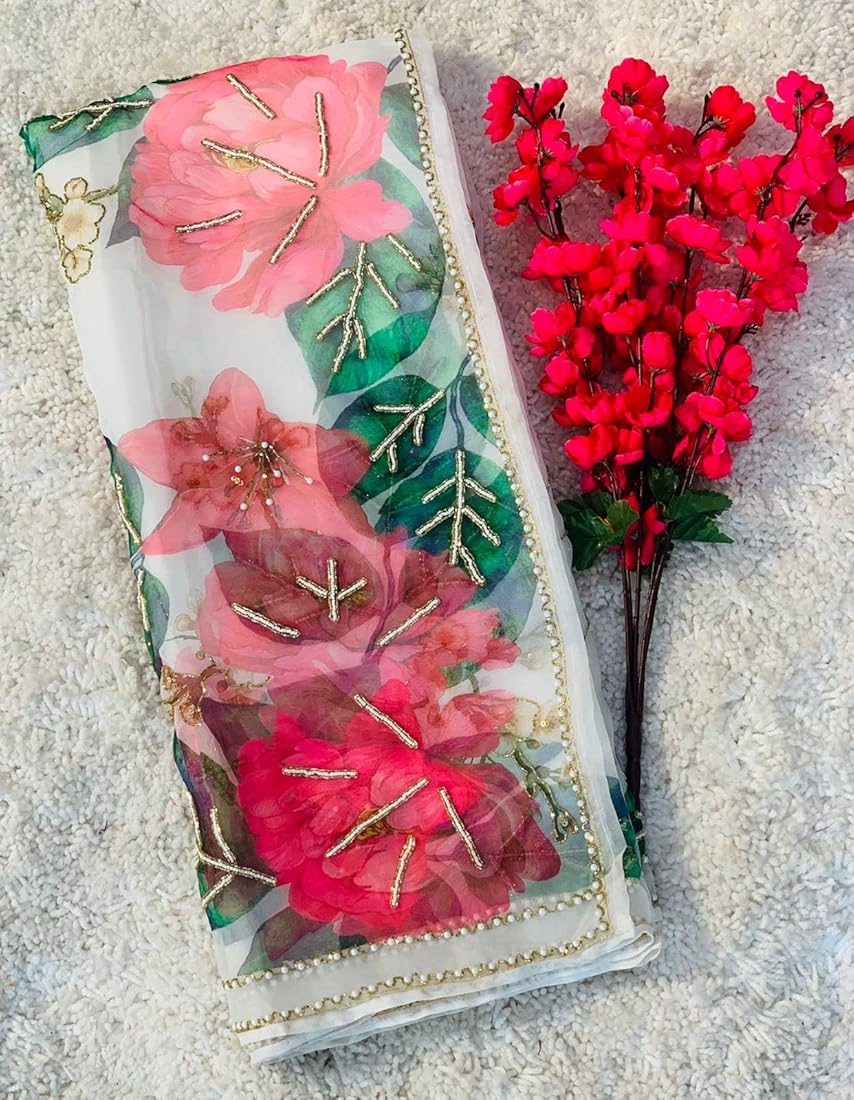 Pearls and Petals Elegant Organza Saree Beautiful print with Heavy Handcrafted Khatli and Pearl work all over saree paired with Plain Cherry Red Color Blouse Piece