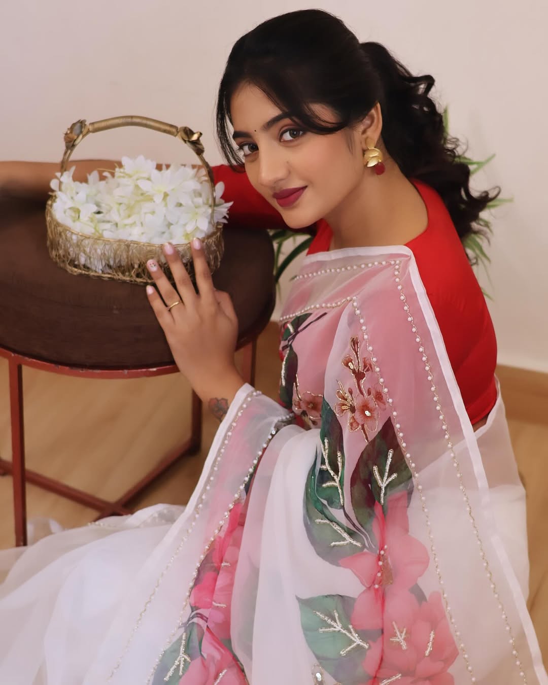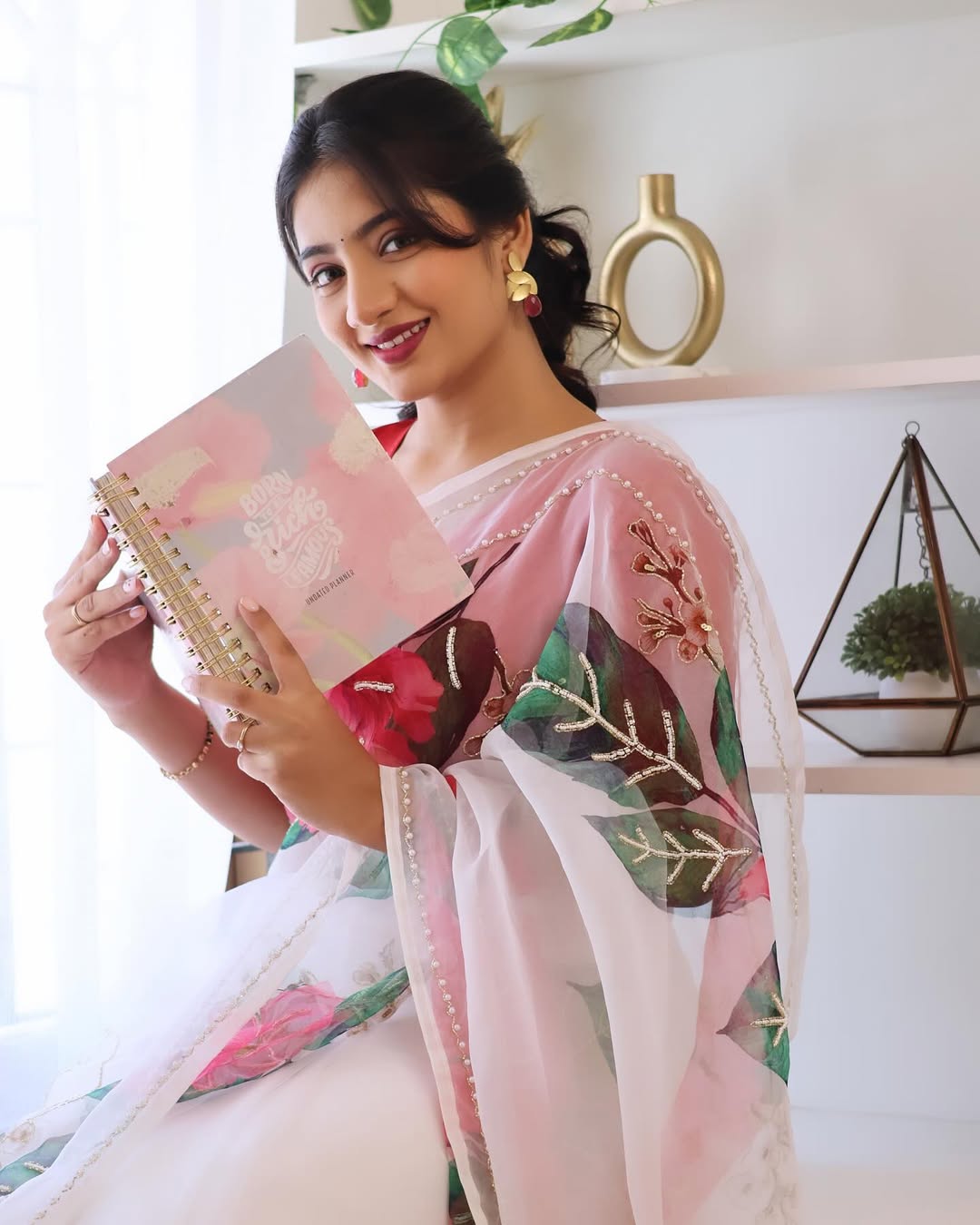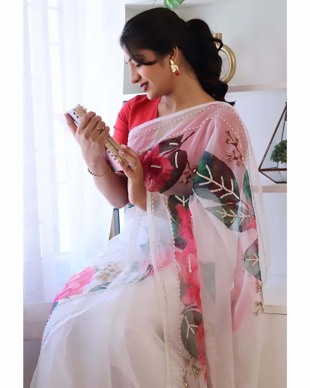 Pearls and Petals Elegant Organza Saree Beautiful print with Heavy Handcrafted Khatli and Pearl work all over saree paired with Plain Cherry Red Color Blouse Piece