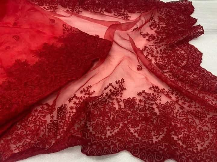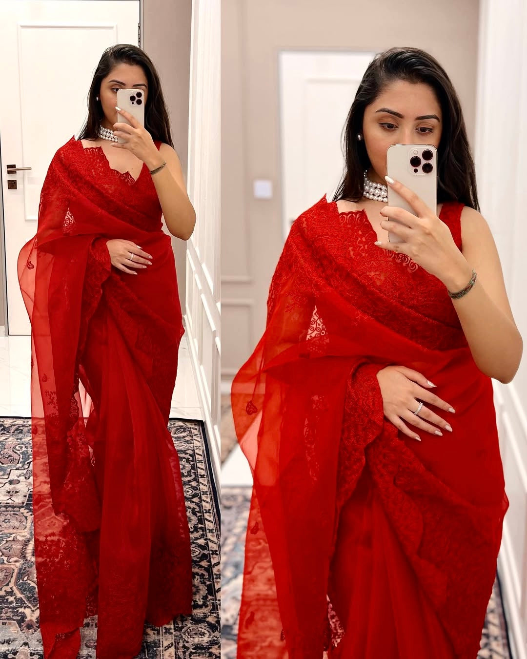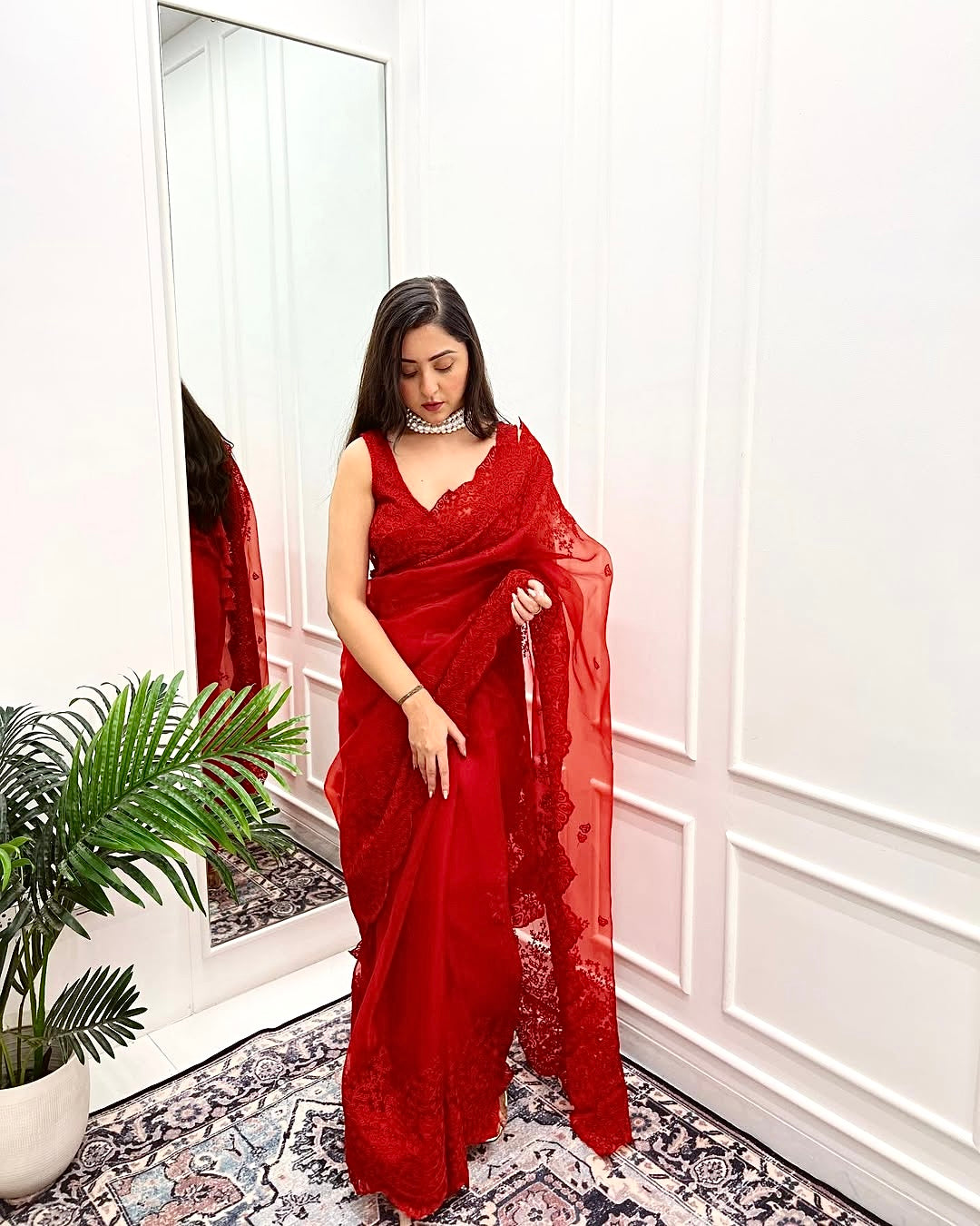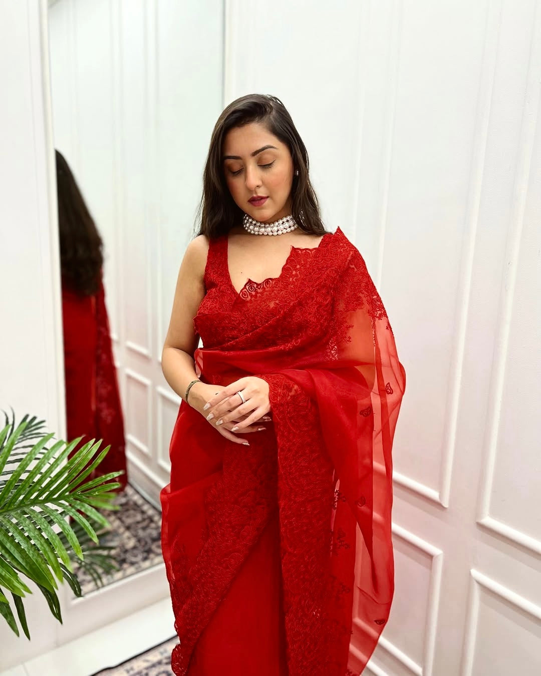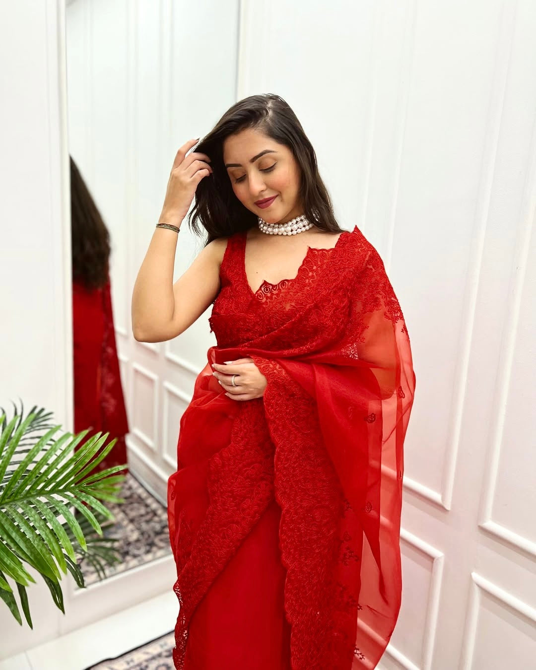 Vermillion Red Color Organza Saree embellished with dori, Hand embroidery and cut-work