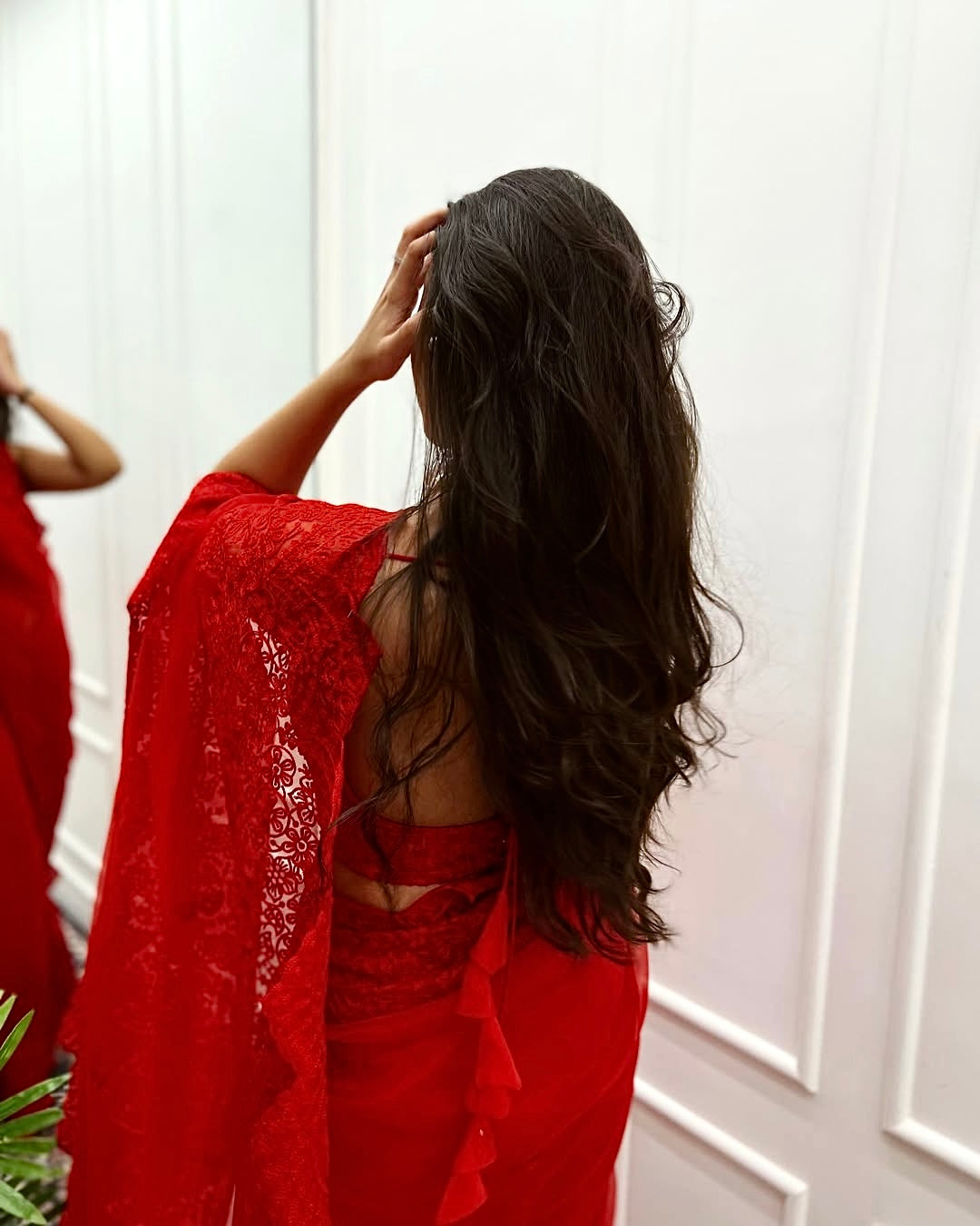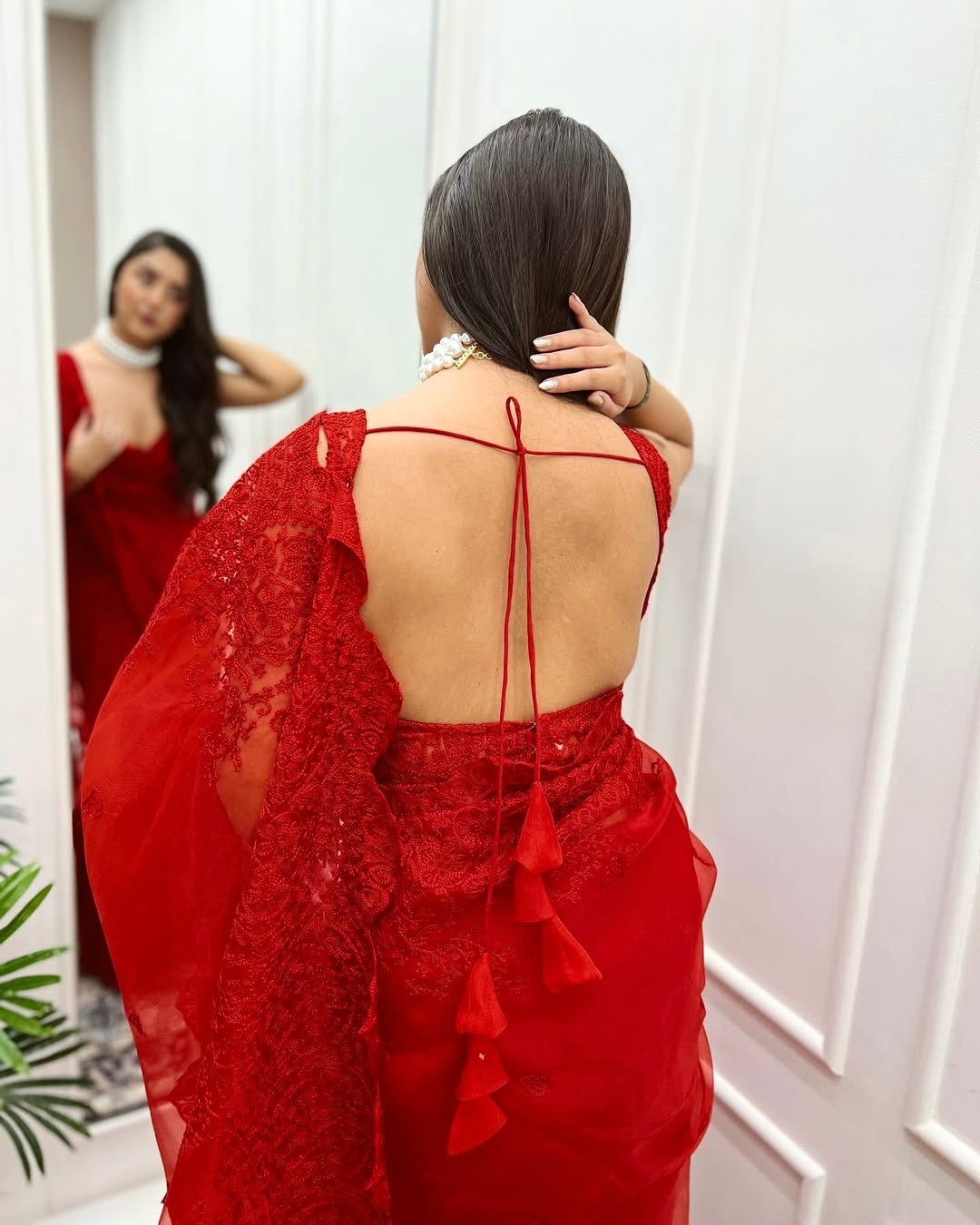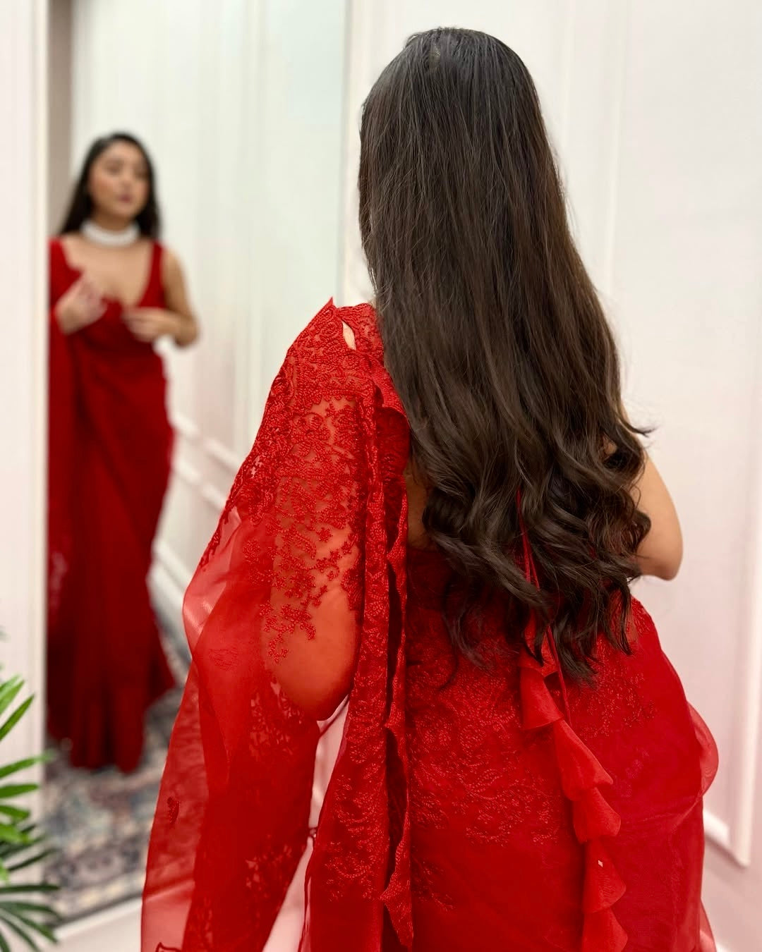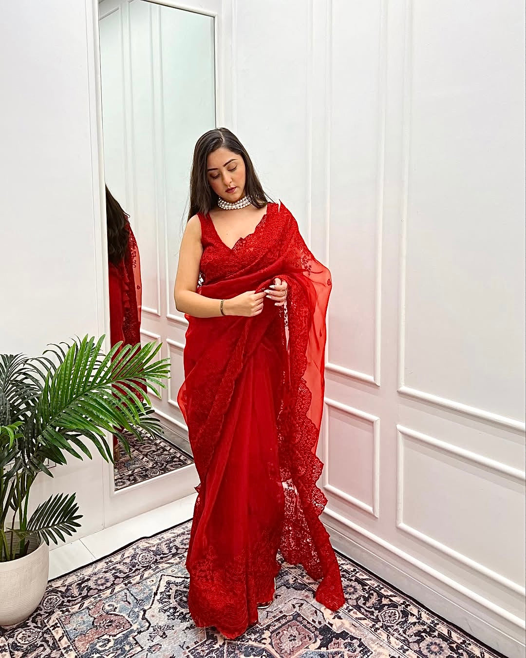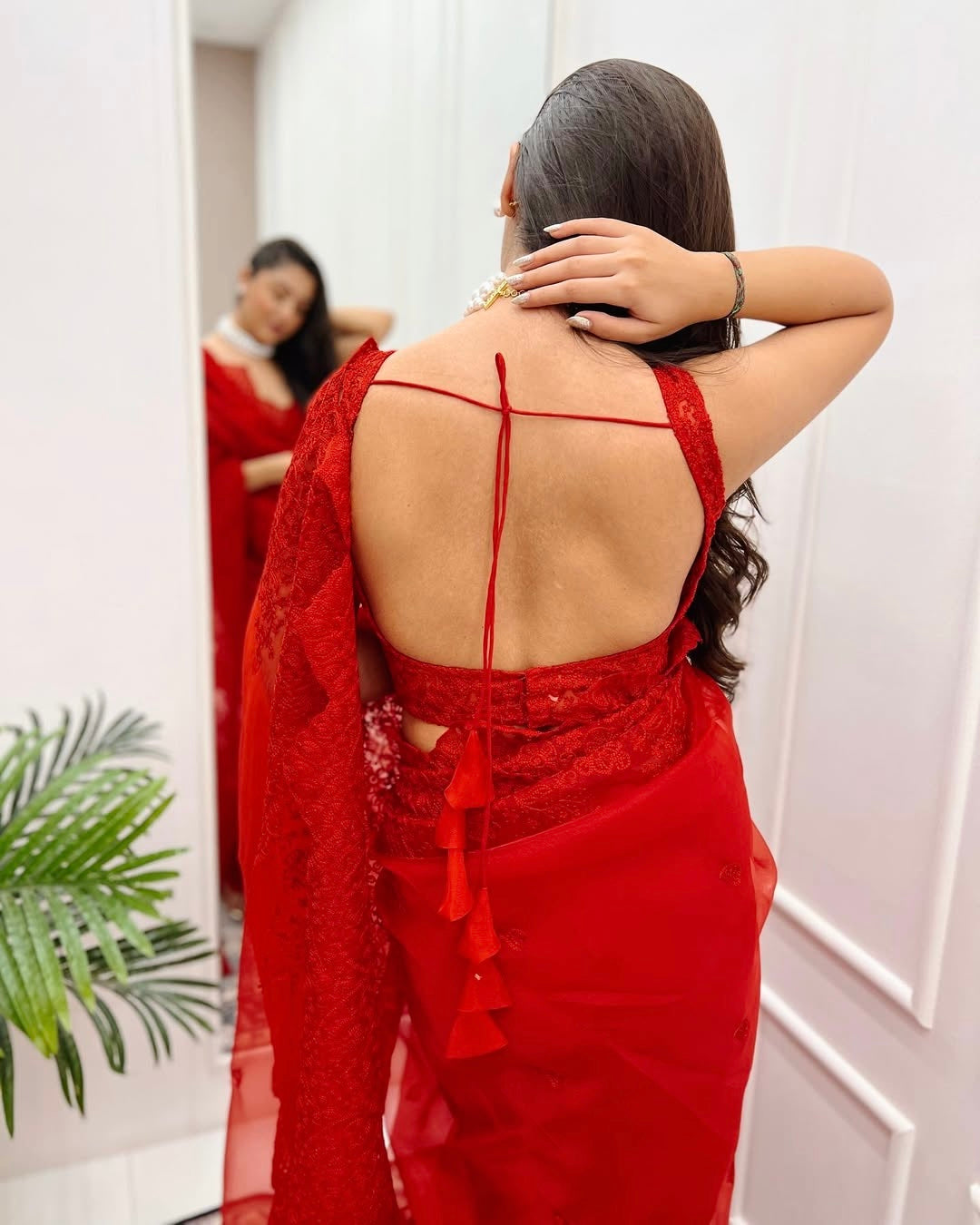 Vermillion Red Color Organza Saree embellished with dori, Hand embroidery and cut-work