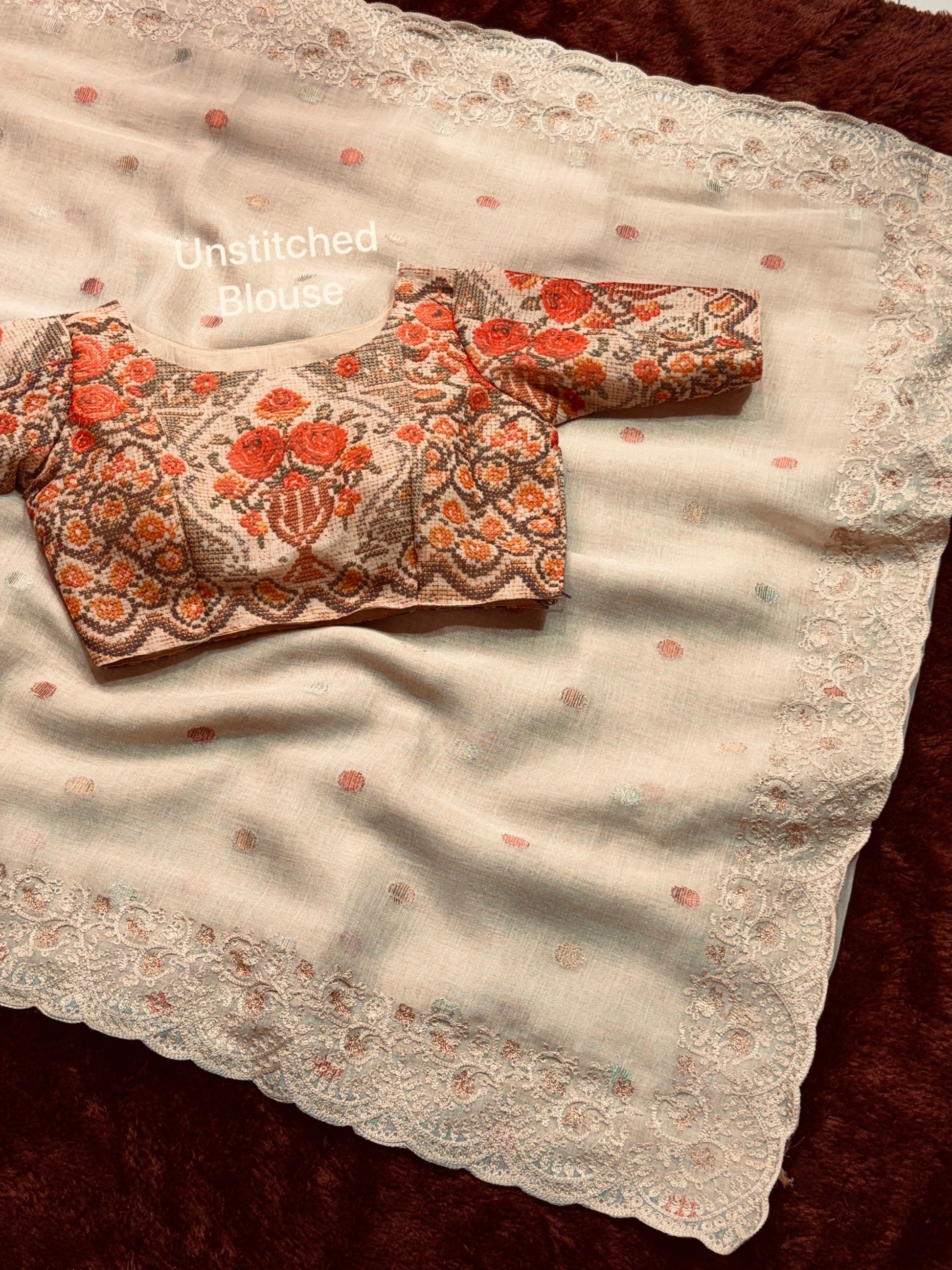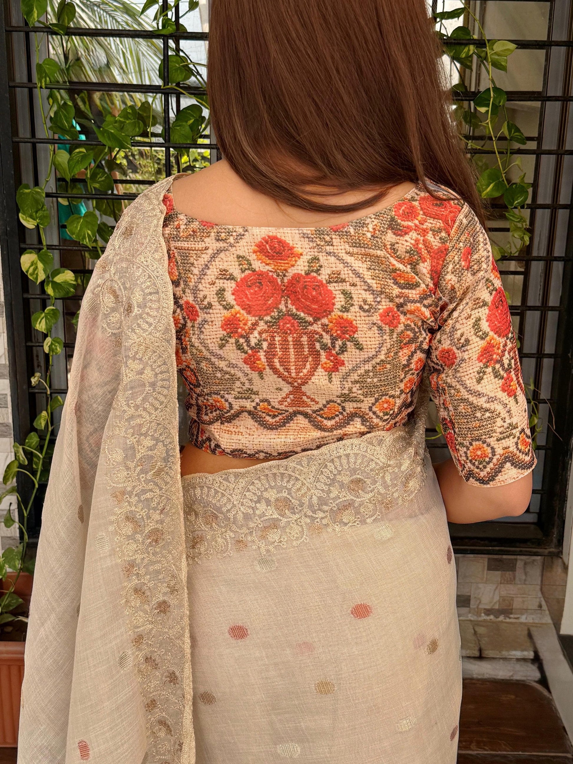 WARM IVORY Color Linen Cotton Saree with Three different shades Jari weaving butti